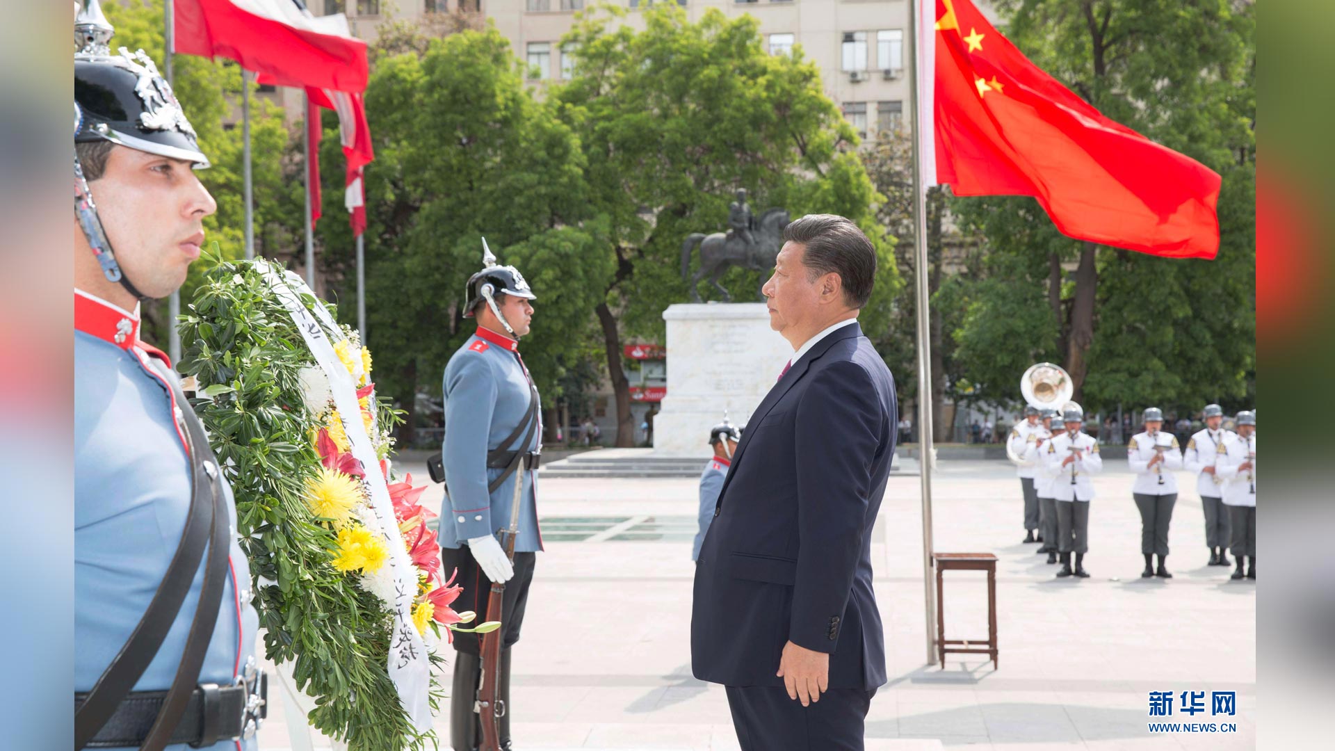11月22日,國(guó)家主席習(xí)近平在圣地亞哥向智利解放者奧希金斯紀(jì)念碑敬獻(xiàn)花圈。 新華社記者 黃敬文 攝2016-11-23