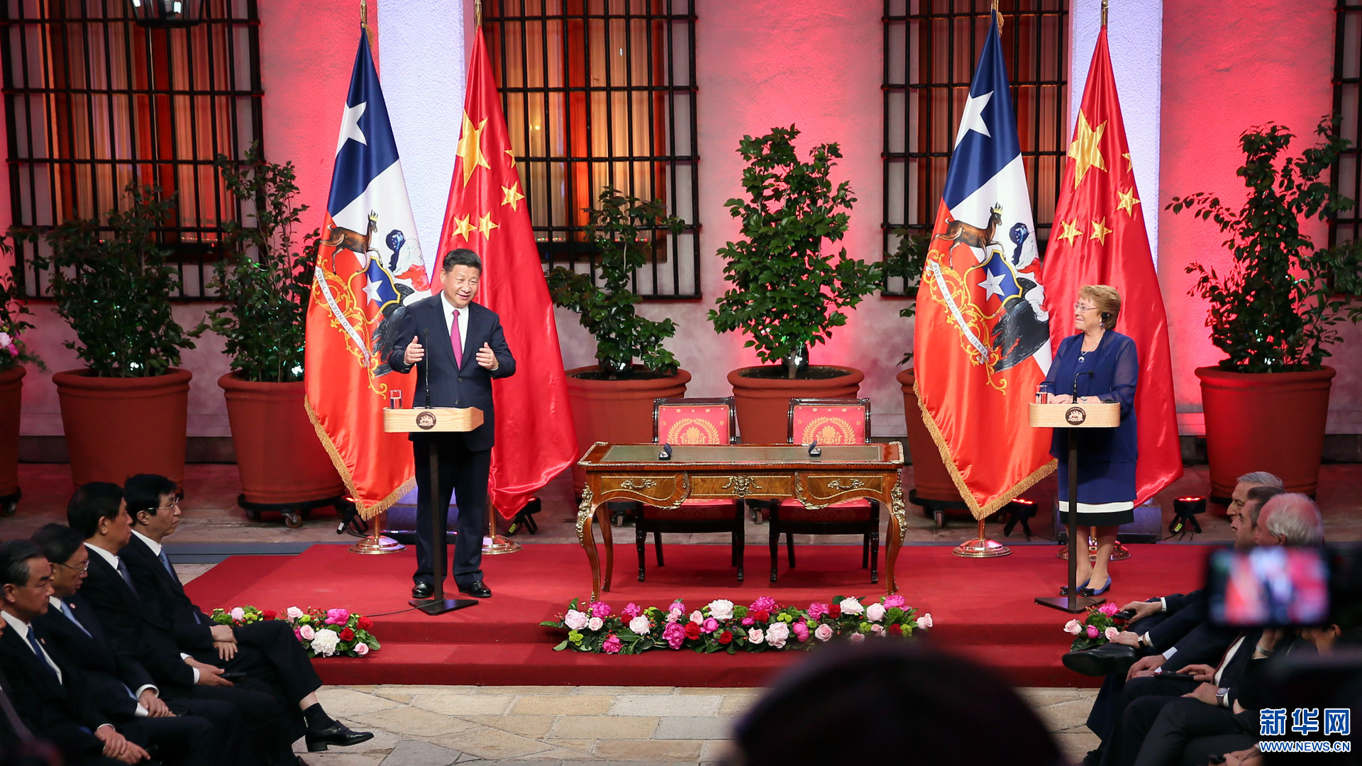 11月22日,國(guó)家主席習(xí)近平在圣地亞哥同智利總統(tǒng)巴切萊特舉行會(huì)談。這是會(huì)談后,兩國(guó)元首共同會(huì)見(jiàn)記者。 新華社記者 蘭紅光 攝2016-11-23