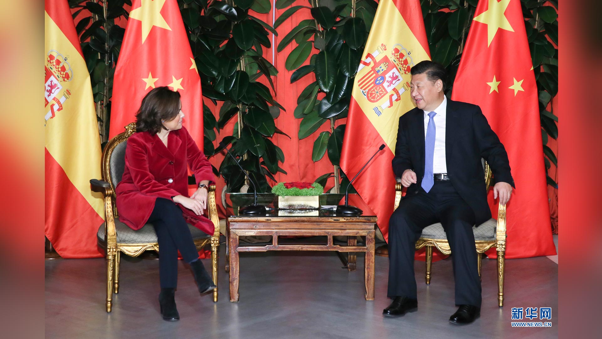 11月24日,國(guó)家主席習(xí)近平在西班牙大加那利島會(huì)見(jiàn)西班牙副首相薩恩斯。 新華社記者 蘭紅光 攝2016-11-25
