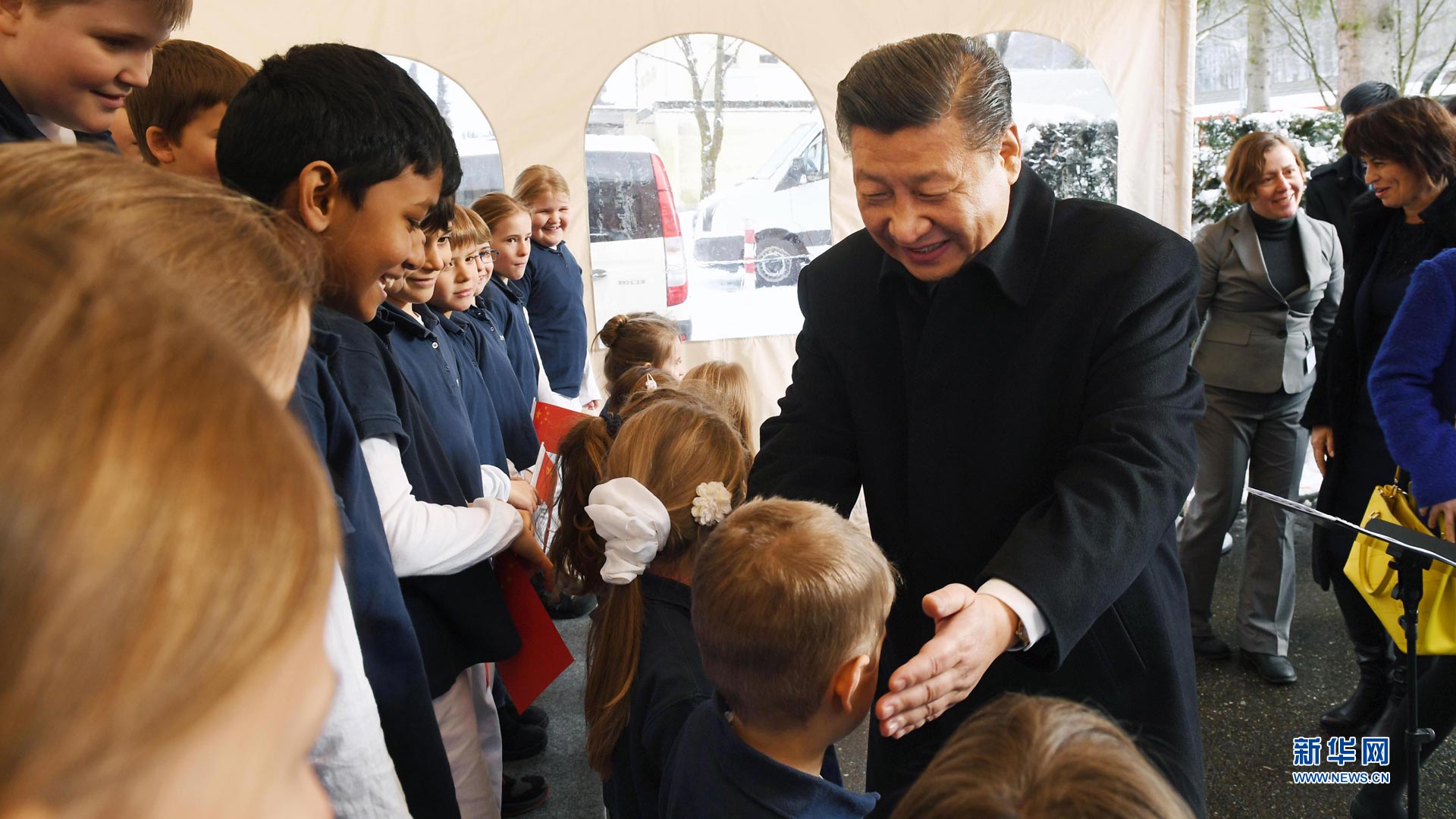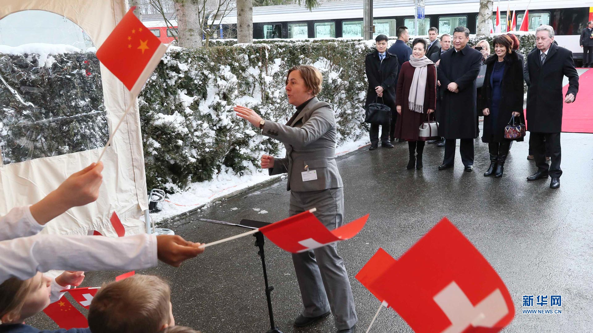 1月15日,國家主席習近平乘專機抵達蘇黎世,開始對瑞士聯(lián)邦進行國事訪問。這是當?shù)貎和蛄暯胶头蛉伺睇愭芦I上鮮花。新華社記者蘭紅光攝2017-01-16