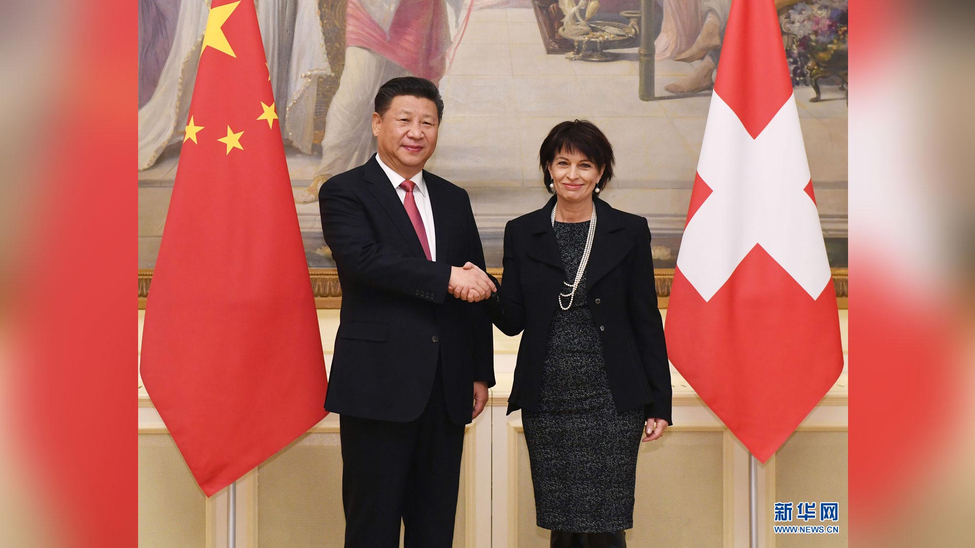1月15日,國家主席習近平在伯爾尼出席瑞士聯(lián)邦委員會全體委員集體舉行的迎接儀式并致辭。這是瑞士聯(lián)邦主席洛伊特哈德夫婦在聯(lián)邦大廈迎接習近平和夫人彭麗媛。 新華社記者蘭紅光攝2017-01-16