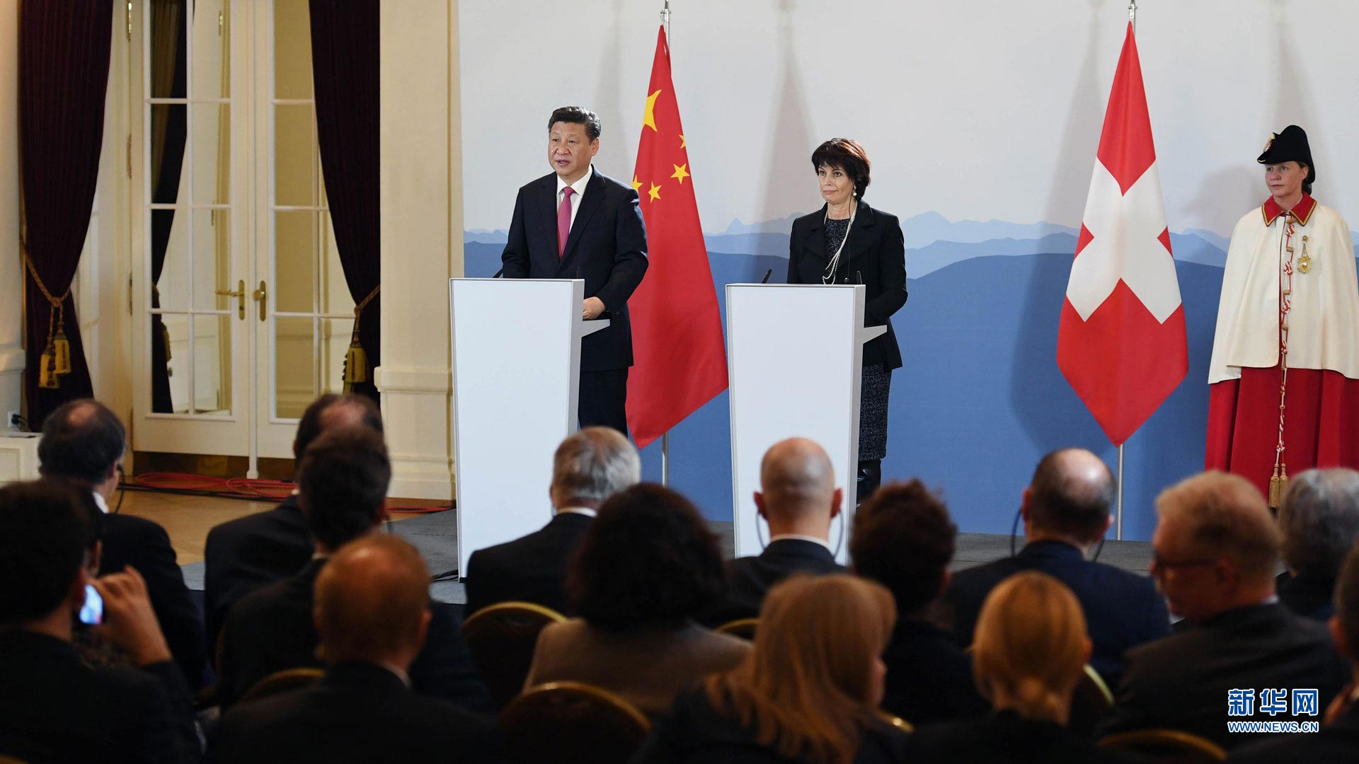 1月16日,國家主席習近平在伯爾尼同瑞士聯(lián)邦主席洛伊特哈德舉行會談。這是會談后,兩國元首共同會見記者。新華社記者 饒愛民 攝2017-01-17