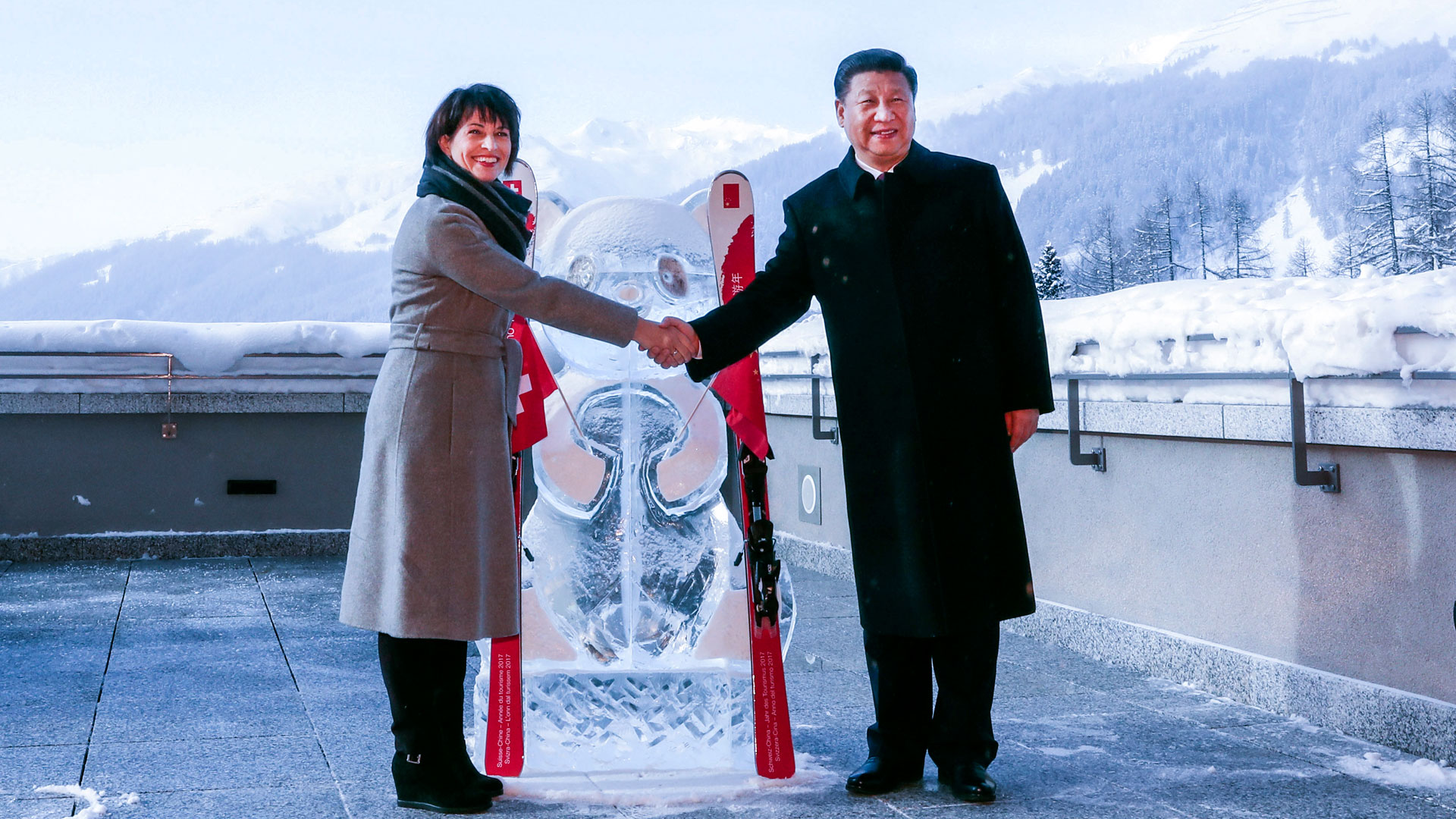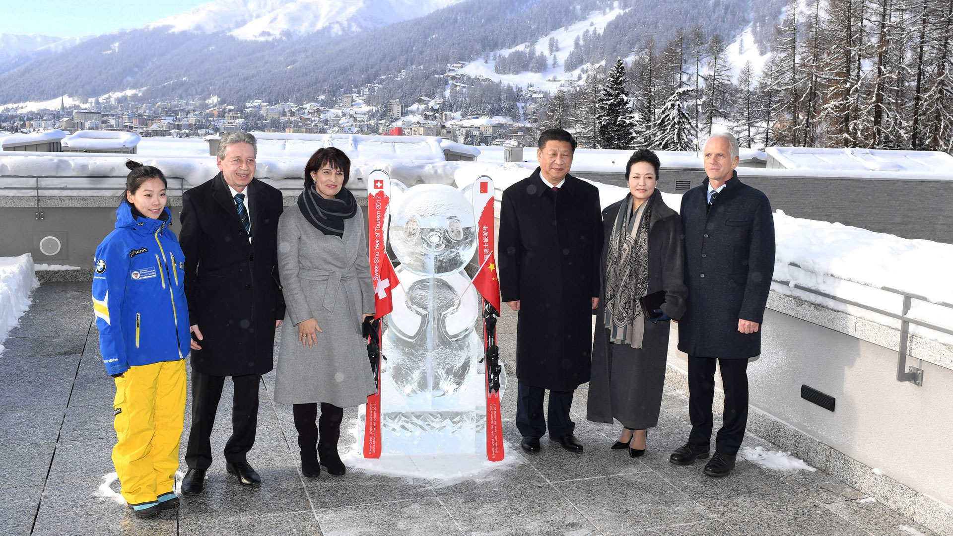 1月17日,國家主席習近平同瑞士聯(lián)邦主席洛伊特哈德在達沃斯共同啟動中瑞旅游年。兩國元首在熊貓冰雕像和印有中瑞兩國國旗及“中瑞旅游年”字樣的滑雪板旁合影留念。新華社記者 丁林 攝2017-01-18