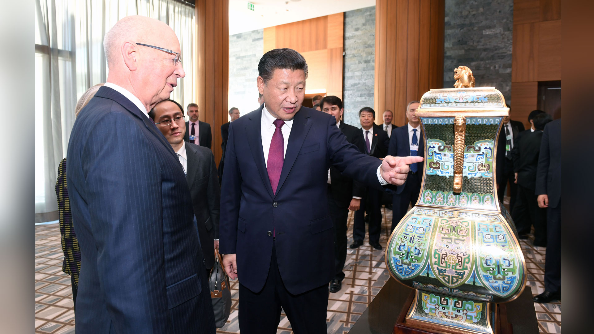 1月17日,國家主席習近平在瑞士達沃斯會見世界經(jīng)濟論壇主席施瓦布。這是習近平向施瓦布介紹中華人民共和國贈送給世界經(jīng)濟論壇的四面方尊。新華社記者 饒愛民 攝2017-01-18