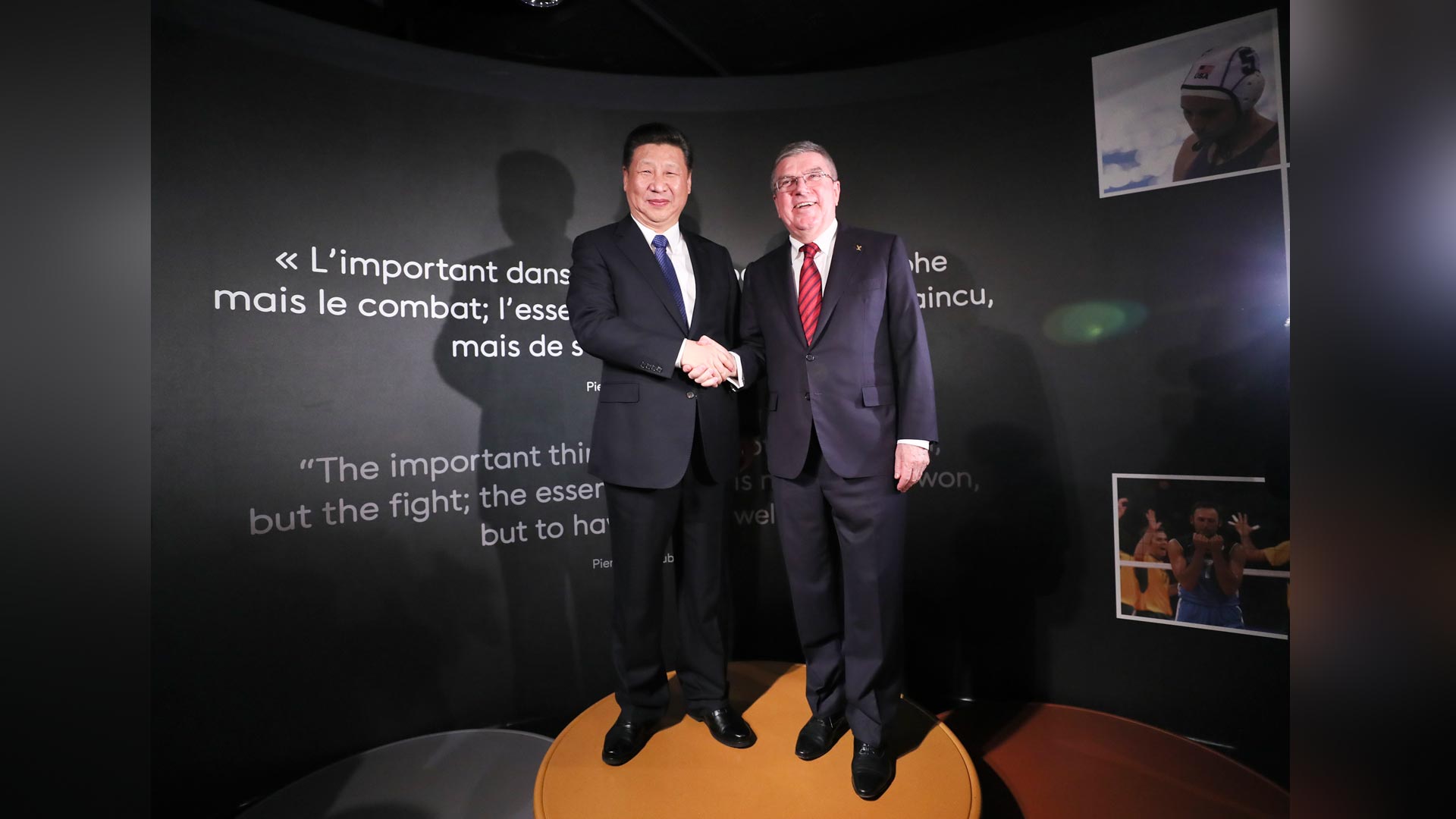 1月18日,國家主席習近平在瑞士洛桑國際奧林匹克博物館會見國際奧林匹克委員會主席巴赫。這是習近平和巴赫在奧運冠軍領(lǐng)獎臺上合影。新華社記者 蘭紅光 攝2017-01-19