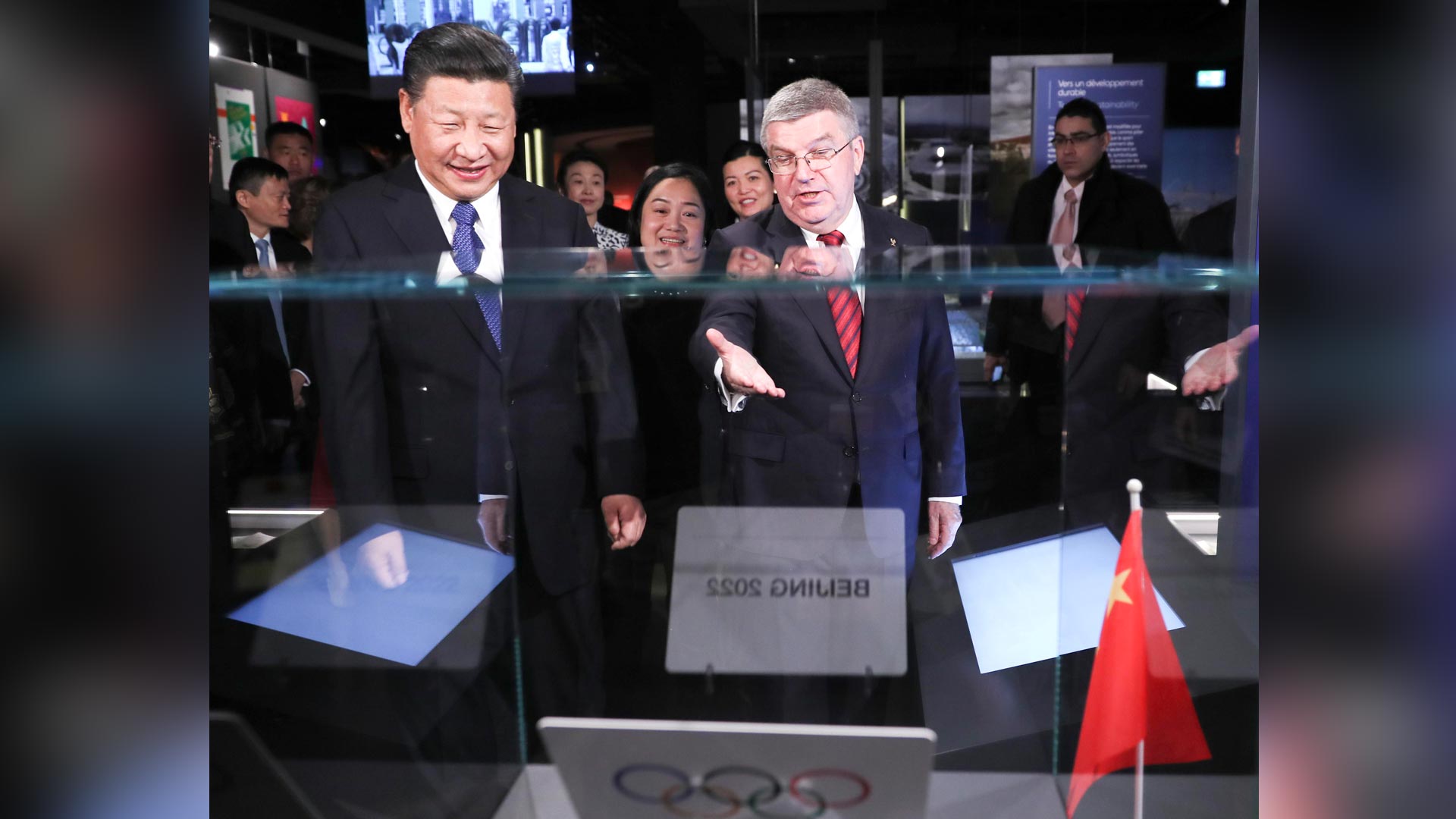 1月18日,國家主席習近平在瑞士洛桑國際奧林匹克博物館會見國際奧林匹克委員會主席巴赫。這是巴赫向習近平介紹他宣布北京獲得2022年冬季奧運會舉辦權(quán)時用的牌子。新華社記者 蘭紅光 攝2017-01-19