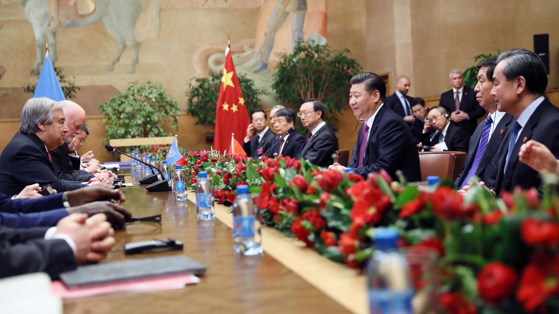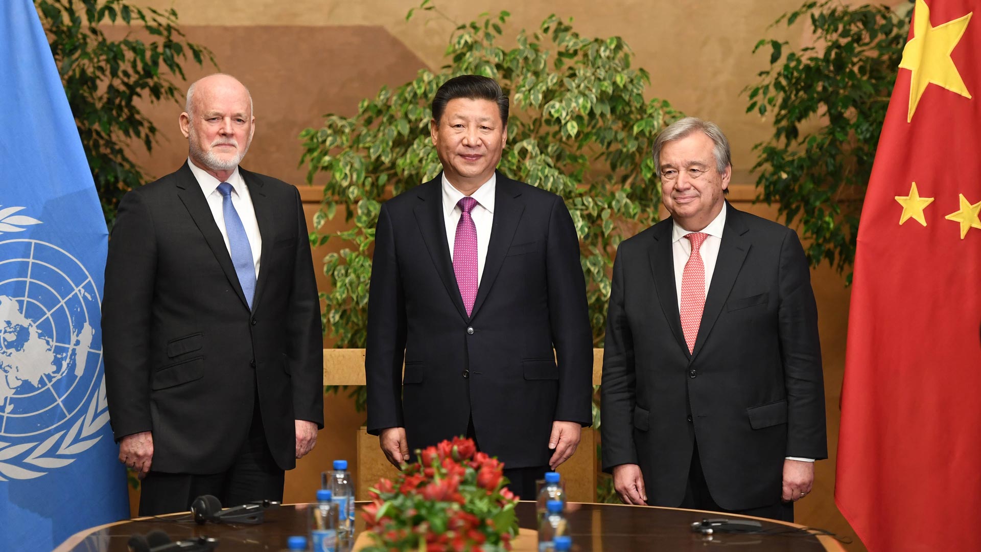 1月18日,國家主席習近平在瑞士日內(nèi)瓦萬國宮會見第71屆聯(lián)合國大會主席湯姆森和聯(lián)合國秘書長古特雷斯。 新華社記者 蘭紅光 攝2017-01-19