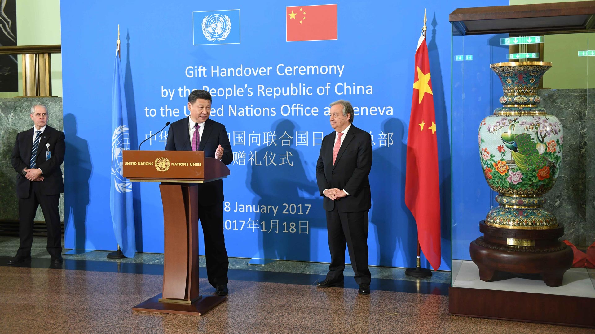 1月18日,國家主席習近平在瑞士日內(nèi)瓦萬國宮出席“共商共筑人類命運共同體”高級別會議,并發(fā)表題為《共同構(gòu)建人類命運共同體》的主旨演講。這是會議結(jié)束后,習近平出席中國向聯(lián)合國日內(nèi)瓦總部贈禮儀式。新華社記者 張鐸 攝2017-01-19