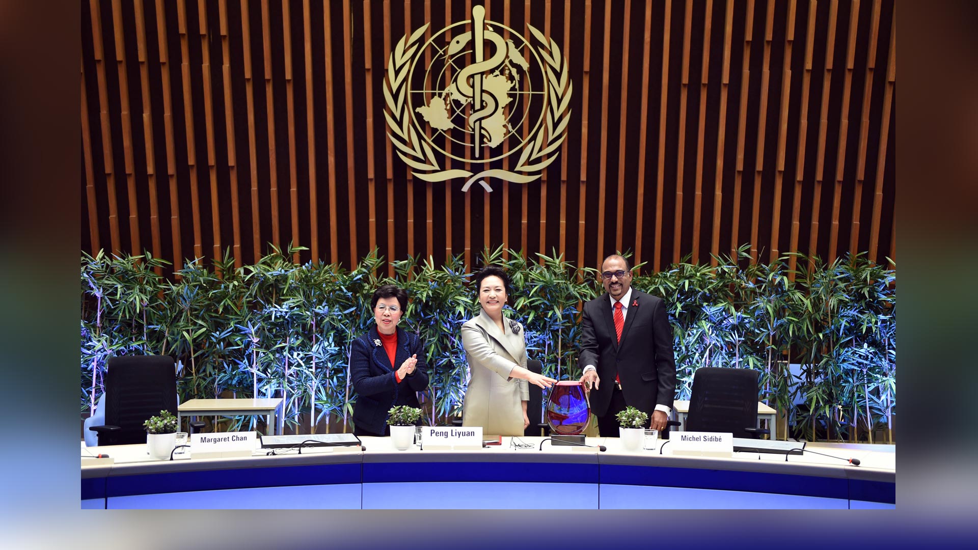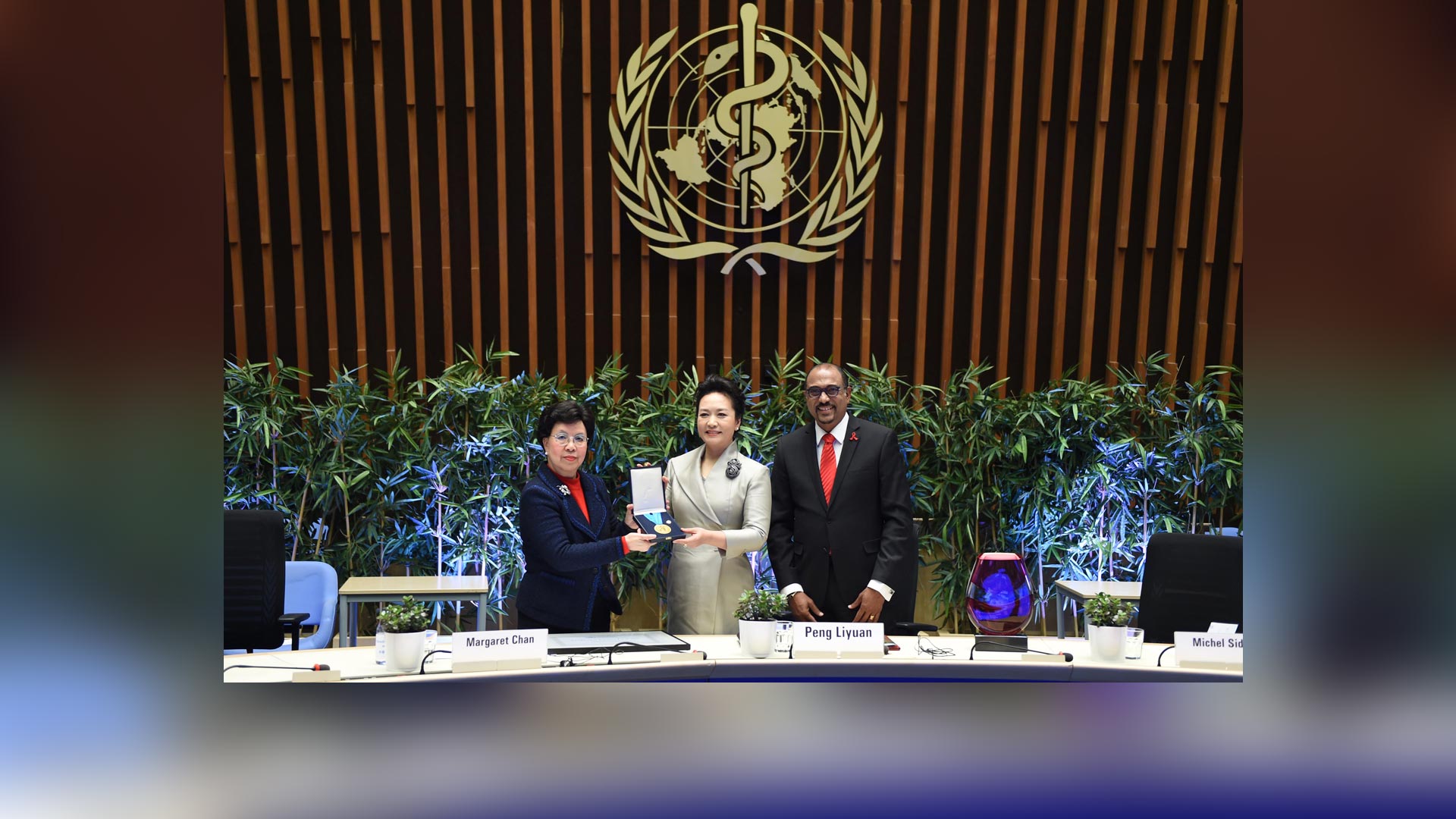 1月18日,國家主席習近平夫人、世界衛(wèi)生組織結(jié)核病和艾滋病防治親善大使彭麗媛應(yīng)世界衛(wèi)生組織總干事陳馮富珍和聯(lián)合國艾滋病規(guī)劃署執(zhí)行主任西迪貝邀請,在瑞士日內(nèi)瓦出席為她舉行的親善大使任期續(xù)延暨頒獎儀式。這是世界衛(wèi)生組織總干事陳馮富珍向彭麗媛頒發(fā)世衛(wèi)組織榮譽勛章。新華社記者謝環(huán)馳攝2017-01-19