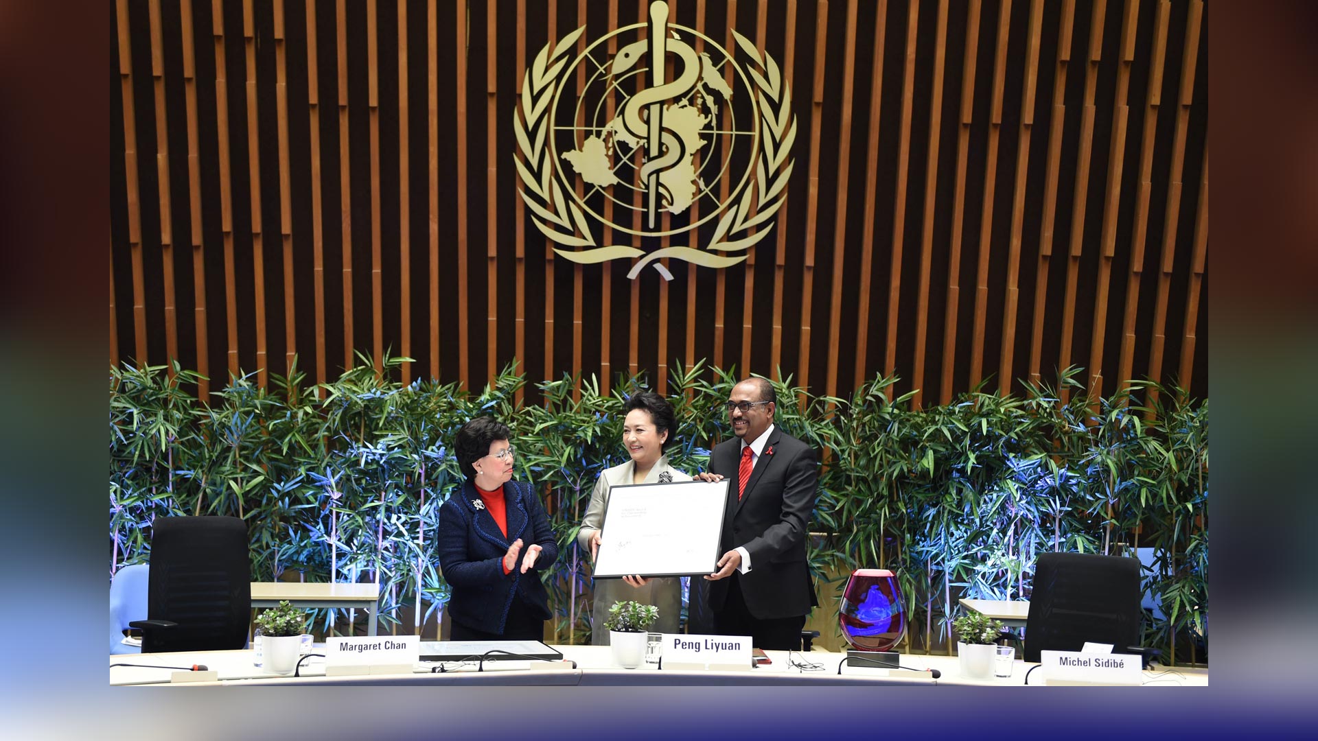 1月18日,國家主席習近平夫人、世界衛(wèi)生組織結(jié)核病和艾滋病防治親善大使彭麗媛應(yīng)世界衛(wèi)生組織總干事陳馮富珍和聯(lián)合國艾滋病規(guī)劃署執(zhí)行主任西迪貝邀請,在瑞士日內(nèi)瓦出席為她舉行的親善大使任期續(xù)延暨頒獎儀式。這是聯(lián)合國艾滋病規(guī)劃署執(zhí)行主任西迪貝向彭麗媛頒發(fā)艾滋病防治“杰出成就獎”獲獎證書。新華社記者謝環(huán)馳攝2017-01-19