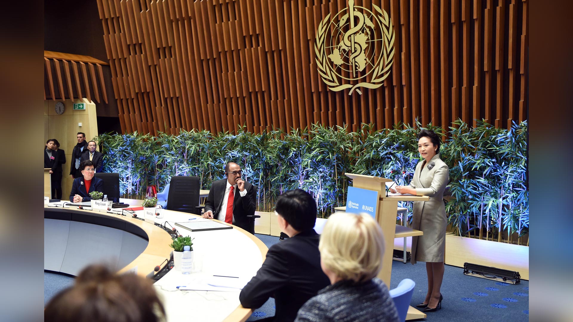 1月18日,國家主席習近平夫人、世界衛(wèi)生組織結(jié)核病和艾滋病防治親善大使彭麗媛應(yīng)世界衛(wèi)生組織總干事陳馮富珍和聯(lián)合國艾滋病規(guī)劃署執(zhí)行主任西迪貝邀請,在瑞士日內(nèi)瓦出席為她舉行的親善大使任期續(xù)延暨頒獎儀式。這是彭麗媛在儀式上致辭。新華社記者謝環(huán)馳攝2017-01-19