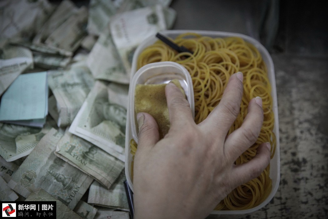 圖為帶著橡膠指套的點(diǎn)鈔工在點(diǎn)鈔。
