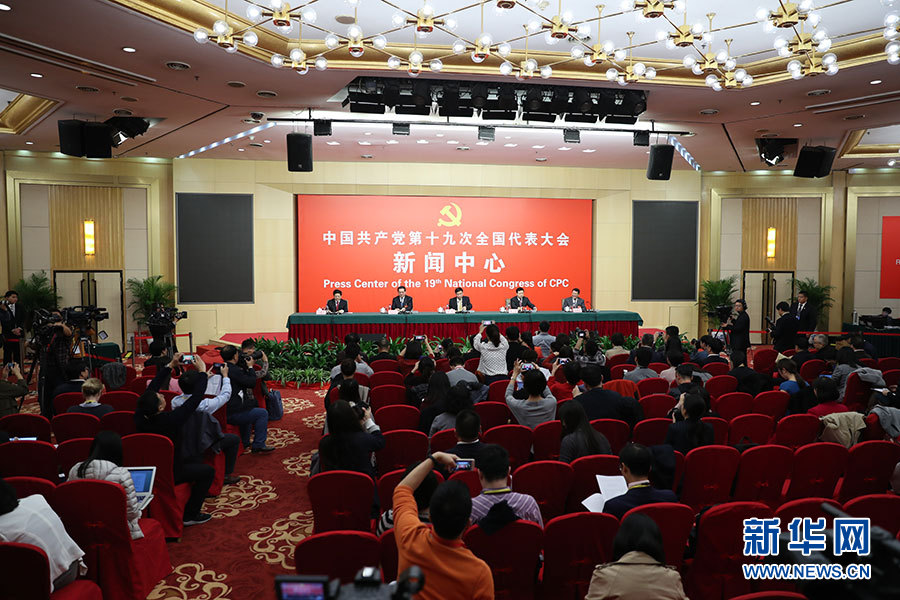 ??? 10月19日,十九大新聞中心舉辦集體采訪,邀請工信和通訊領(lǐng)域代表談走新型工業(yè)化道路。圖為采訪現(xiàn)場。新華網(wǎng) 郝廣鵬攝