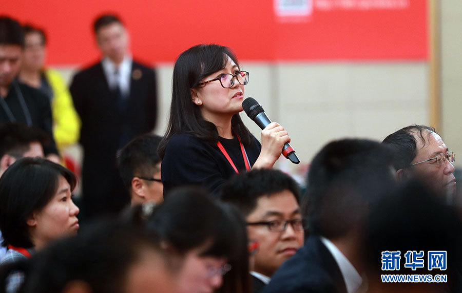 ??? 10月20日,十九大新聞中心舉辦集體采訪活動(dòng),主題為“文化發(fā)展開創(chuàng)新局面”。圖為中央人民廣播電臺(tái)記者提問。新華網(wǎng) 陳杰攝
