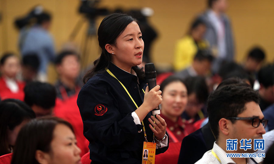 ??? 10月20日,十九大新聞中心舉辦集體采訪活動(dòng),主題為“實(shí)施創(chuàng)新驅(qū)動(dòng)發(fā)展戰(zhàn)略”。圖為人民網(wǎng)記者提問。新華網(wǎng) 郝廣鵬攝