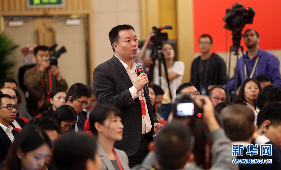 10月21日,十九大新聞中心舉辦記者招待會,邀請國家發(fā)展改革委黨組書記、主任何立峰,副主任張勇,副主任寧吉喆介紹以新發(fā)展理念為引領(lǐng),推進(jìn)中國經(jīng)濟(jì)平穩(wěn)健康可持續(xù)發(fā)展有關(guān)情況,并回答記者提問。圖為人民鐵道報(bào)記者提問。新華網(wǎng) 郝廣鵬攝