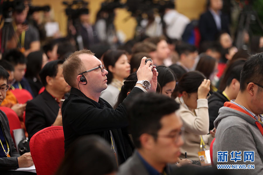 10月23日,十九大新聞中心舉辦記者招待會(huì),邀請(qǐng)中央財(cái)經(jīng)領(lǐng)導(dǎo)小組辦公室副主任楊偉民,環(huán)境保護(hù)部黨組書記、部長(zhǎng)李干杰介紹踐行綠色發(fā)展理念,建設(shè)美麗中國(guó)有關(guān)情況,并回答記者提問。圖為現(xiàn)場(chǎng)記者。新華網(wǎng) 郝廣鵬攝