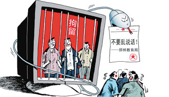 | 江蘇邳州教育局今年8月27日向該市各中小學、民辦學校等機構(gòu)下發(fā)了一個紅頭文件。文件稱,去年以來邳州已有3名教師因在互聯(lián)網(wǎng)上散布不實言論被拘留,廣大教師“要注意形象,講政治,講大局,不該做的事不要做、不該說的話不亂說”,文件的真實性得到了邳州市教育局辦公室主任的證實。 |