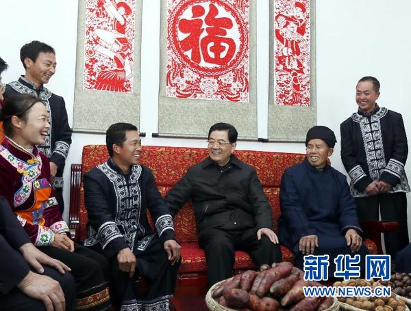 ????12月1日至6日,國家主席胡錦濤在貴州考察工作。這是胡錦濤在畢節(jié)市黔西縣烏騾壩村親切看望布依族村民潘安平一家。 新華社記者 鞠鵬 攝