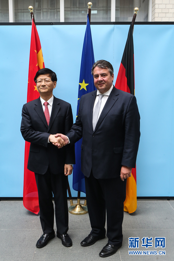 ?? ?6月29日,習(xí)近平主席特使、中共中央政治局委員、中央政法委書記孟建柱(左)在德國首都柏林會(huì)見德國副總理兼經(jīng)濟(jì)和能源部長(zhǎng)加布里爾。新華社記者張帆攝