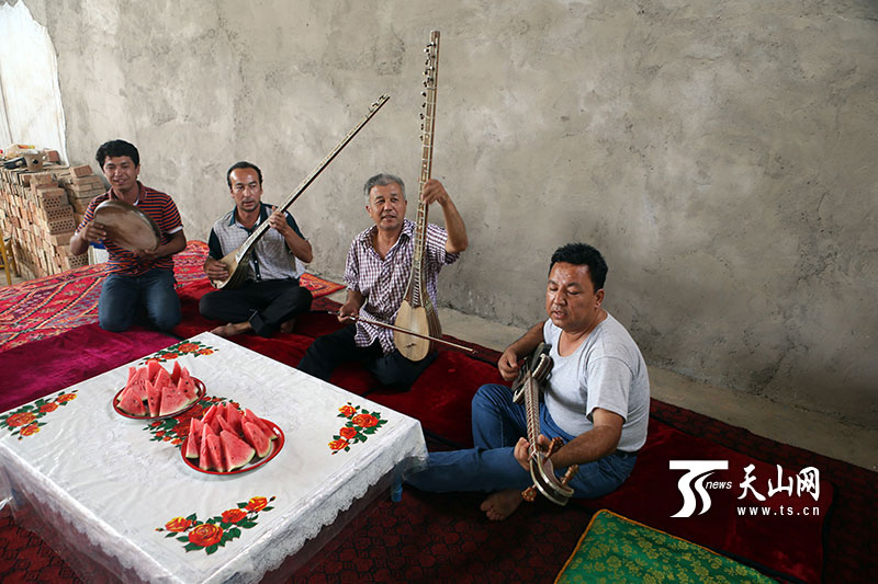 7月10日,蘇來曼·阿不都(右二)與村里的民間藝人一起奏唱《十二木卡姆》。新疆經(jīng)濟(jì)報(bào)記者 李瑞 攝