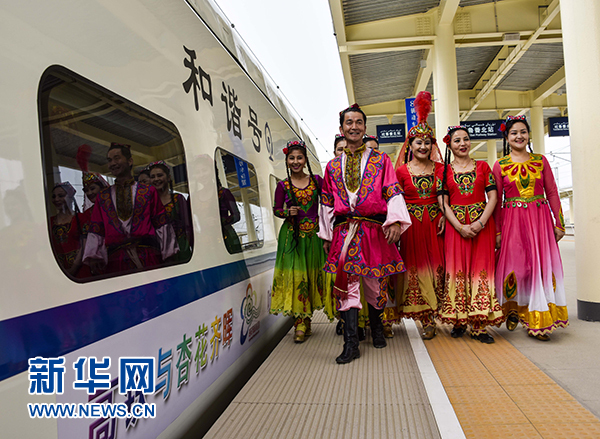 身穿民族服飾的當?shù)鼐用裨谕卖敺闭居邮着俗案哞F杏花專列”抵達前來旅游的游客(2015年3月21日攝)。 新華社記者 趙戈 攝