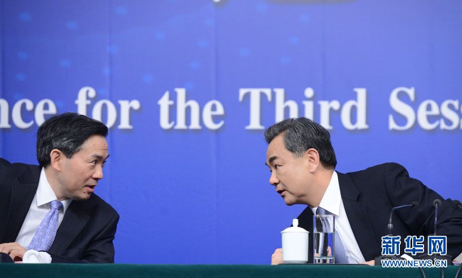 ??? 十二屆全國(guó)人大三次會(huì)議新聞中心于3月8日(星期日)10時(shí)在梅地亞中心多功能廳舉行記者會(huì),邀請(qǐng)外交部部長(zhǎng)王毅就中國(guó)的外交政策和對(duì)外關(guān)系相關(guān)問(wèn)題回答中外記者提問(wèn)。圖為外交部部長(zhǎng)王毅與記者會(huì)主持人交流。新華網(wǎng)/中國(guó)政府網(wǎng) 郭小天 攝