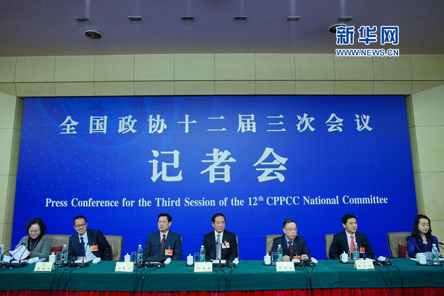 ?? 全國(guó)政協(xié)十二屆三次會(huì)議舉行記者會(huì),邀請(qǐng)全國(guó)政協(xié)常委朱維群、黃潔夫和全國(guó)政協(xié)委員胡曉義、李彥宏、俞敏洪等談促進(jìn)民生改善與社會(huì)和諧穩(wěn)定,并回答記者提問(wèn)。圖為記者會(huì)現(xiàn)場(chǎng)。新華網(wǎng)/中國(guó)政府網(wǎng)?郭小天 攝
