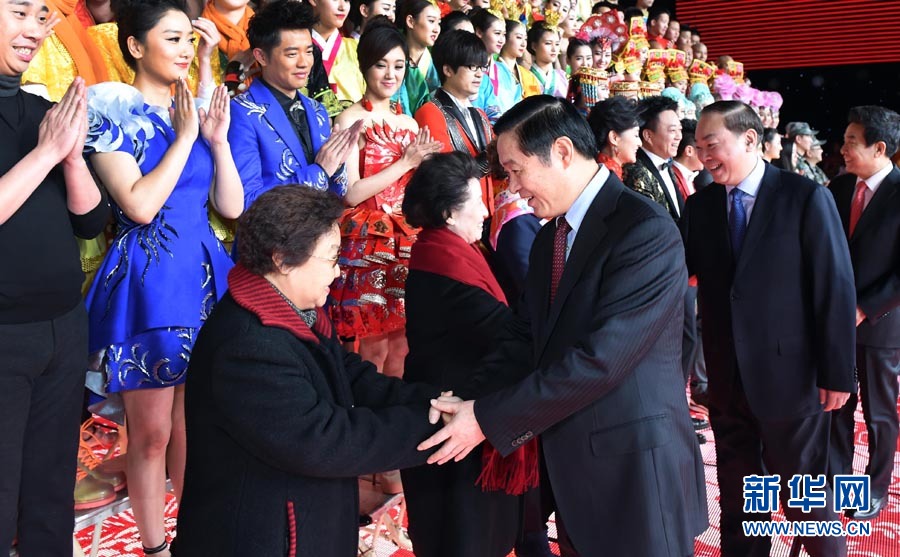 ??? 2月5日,中共中央政治局委員、中央書記處書記、中宣部部長劉奇葆在北京中央電視臺春節(jié)聯(lián)歡晚會彩排現(xiàn)場,親切看望正在緊張工作的演職人員。新華社記者 張鐸 攝