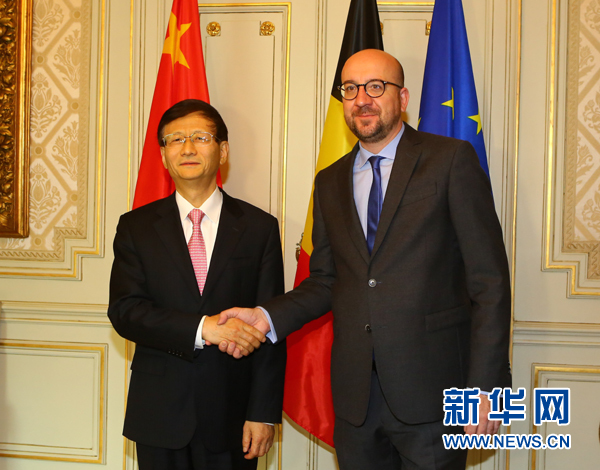 5月19日,在比利時首都布魯塞爾,比利時首相米歇爾(右)會見到訪的習(xí)近平主席特使、中共中央政治局委員、中央政法委書記孟建柱。新華社記者龔兵攝