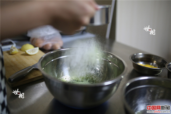 陳騫要求每一道工序都要精心制作,這樣蛋糕才能達(dá)到理想中的口味。圖為陳騫用篩子將綠茶粉均勻撒入甜點(diǎn)原料中。
