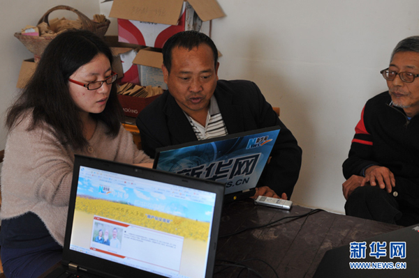 圖為記者采訪2013年感動中國年度人物——湖南省常德市臨澧縣楊橋村一對種植油菜花的農(nóng)民父子