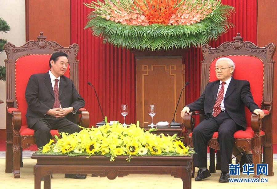 12月22日,越南共產(chǎn)黨中央總書記阮富仲(右)在河內(nèi)會(huì)見(jiàn)率中共代表團(tuán)出席第十二次中越兩黨理論研討會(huì)的中共中央政治局委員、中央書記處書記、中宣部部長(zhǎng)劉奇葆。新華社記者樂(lè)艷娜攝
