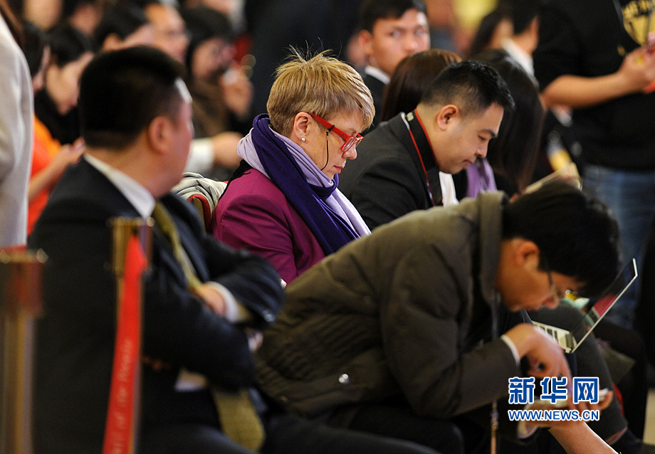 3月16日上午,國務(wù)院總理李克強(qiáng)在人民大會(huì)堂三樓金色大廳會(huì)見采訪十二屆全國人大四次會(huì)議的中外記者并回答記者提出的問題。圖為早早趕到記者會(huì)現(xiàn)場(chǎng)的各路媒體記者。新華網(wǎng)/中國政府網(wǎng) 陳競超 攝