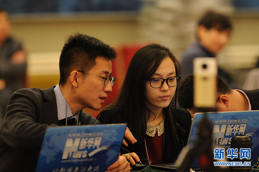 3月16日上午,國(guó)務(wù)院總理李克強(qiáng)在人民大會(huì)堂三樓金色大廳會(huì)見采訪十二屆全國(guó)人大四次會(huì)議的中外記者并回答記者提出的問題。圖為新華網(wǎng)記者準(zhǔn)備總理記者會(huì)直播。新華網(wǎng)/中國(guó)政府網(wǎng) 陳杰攝