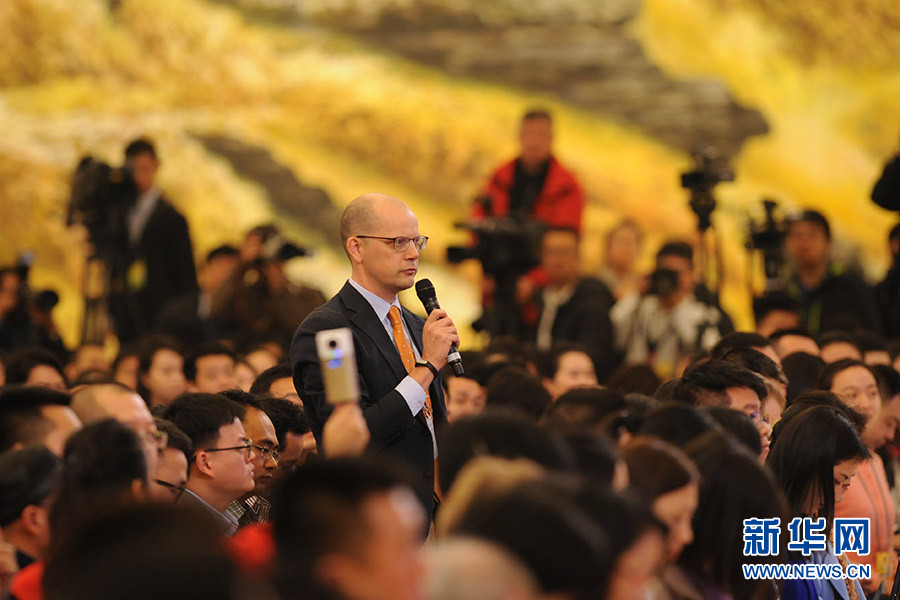 3月16日上午,國務(wù)院總理李克強(qiáng)在人民大會堂三樓金色大廳會見采訪十二屆全國人大四次會議的中外記者并回答記者提出的問題。圖為彭博新聞社記者提問。新華網(wǎng)/中國政府網(wǎng) 陳杰攝