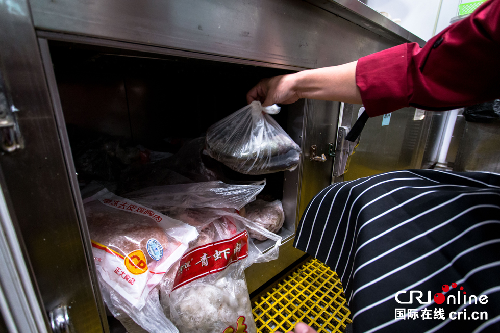 隨旅客一起啟程的還有幾十斤蔬菜、蒸好的兩屜米飯、幾條活魚(yú)和一些鮮蝦。在這14個(gè)小時(shí)的旅途中,廚師長(zhǎng)白振慶和他的老搭檔將用這些食材,在只有幾平米的廚房?jī)?nèi)盡可能烹調(diào)出可口的菜肴。圖為白振慶師傅檢查備品情況。