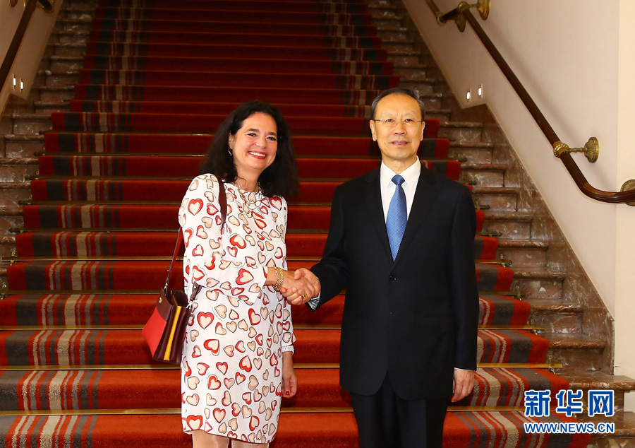 7月4日,在比利時(shí)首都布魯塞爾,中共中央書記處書記、全國政協(xié)副主席杜青林(右)會(huì)見比利時(shí)聯(lián)邦參議長德弗萊涅。應(yīng)德弗萊涅邀請(qǐng),杜青林率中共代表團(tuán)于7月4日至5日訪問比利時(shí)。 新華社記者龔兵攝