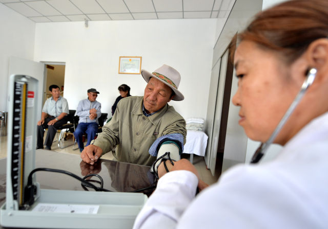 7月5日,60歲的牧民哈斯朝魯在阿巴嘎旗“哈樂(lè)穆吉”養(yǎng)老中心測(cè)量血壓。新華社記者 任軍川 攝