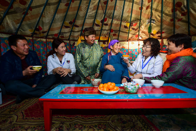 2月20日,蒙古族牧民和漢族醫(yī)生在蒙古包內(nèi)拉家常。新華社記者 連振 攝
