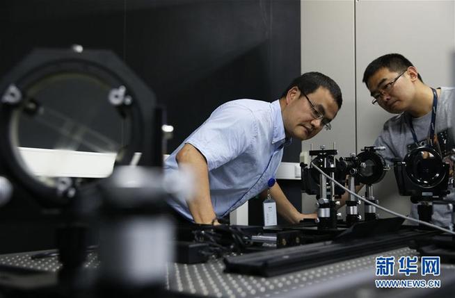 在上海張江國家科學中心,冷用斌(左)和同事在上海光源同步光診斷實驗室內做實驗(2015年5月27日攝)。新華社記者 裴鑫 攝