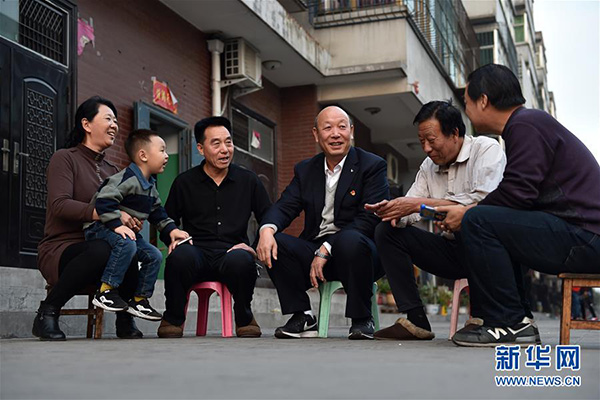11月8日,在山西省河津市清澗街道辦龍門(mén)村,原貴生(右三)和村民聊天。新華社記者 詹彥 攝