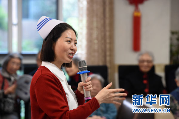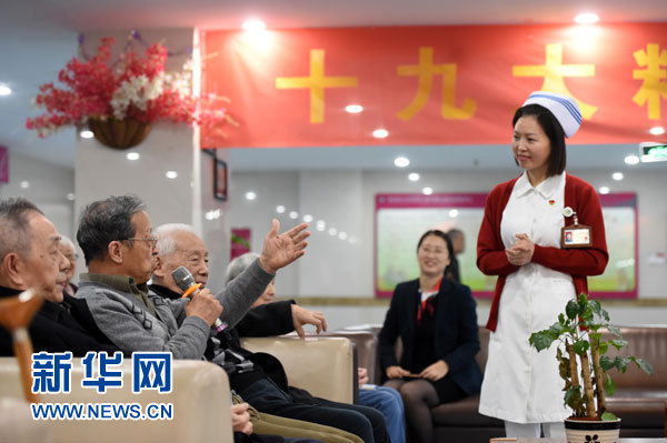 在重慶市青杠老年護養(yǎng)中心,趙慶華像拉家常一樣,給老人們講起十九大精神(11月1日攝)。新華社記者 唐奕 攝