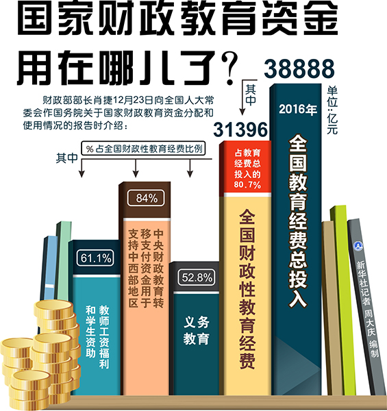 新華社北京12月23日電(記者胡浩郁瓊源)受國務院委托,財政部部長肖捷23日向全國人大常委會作國務院關于國家財政教育資金分配和使用情況的報告時介紹,2016年我國財政性教育經(jīng)費一半以上用于義務教育,一半以上用于中西部地區(qū)并向農(nóng)村傾斜,一半以上用于教師工資福利和學生資助。