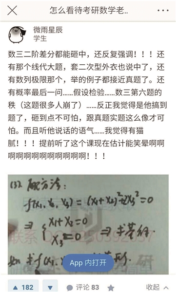 昨天上午,多名網(wǎng)友發(fā)微博爆料稱,2018年全國碩士研究生統(tǒng)一招生考試數(shù)學(xué)科目出現(xiàn)“神押題”,一位名為“李林”的教師在考前押題視頻中舉的例題與實(shí)際考研的考試試題十分相似。網(wǎng)友指出,李林押題“命中率”高達(dá)80%,甚至連超綱的二階差分都反復(fù)強(qiáng)調(diào)?!懊磕暄褐袔讉€(gè)題已經(jīng)很牛了,這位老師押中線代大題原題、證明題原題也就罷了,連超綱的二階微分都猜中,并且反復(fù)強(qiáng)調(diào)?!?/p>