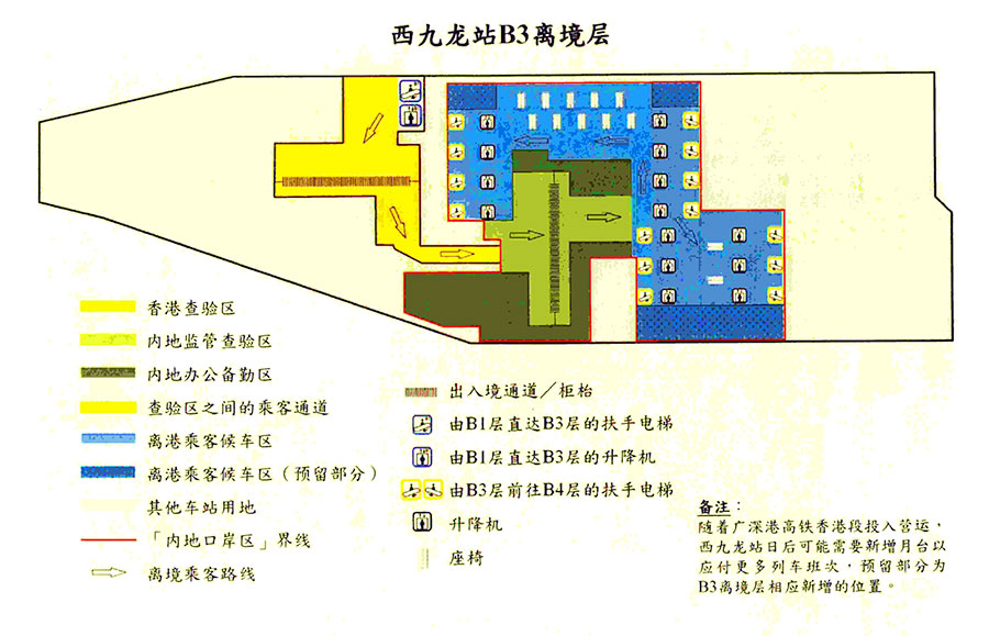 西九龍站口岸分為香港口岸區(qū)和內(nèi)地口岸區(qū)。香港口岸區(qū)由香港特區(qū)依據(jù)特區(qū)法律設(shè)立和管轄,實(shí)行過境限制區(qū)管理。內(nèi)地口岸區(qū)由內(nèi)地根據(jù)本合作安排和內(nèi)地法律設(shè)立和管轄,實(shí)行口岸管理制度。