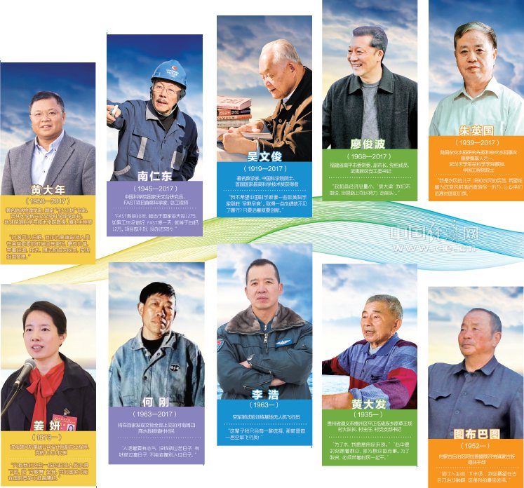 回首2017年,我國各行各業(yè)涌現(xiàn)出一批有理想情懷、有人格魅力、有卓越言行的時代先鋒。這當(dāng)中,有先后3次將自家挖出的國家級文物上交故宮博物院的普通農(nóng)民,也有帶領(lǐng)當(dāng)?shù)厝罕娪?0年的時間在懸崖峭壁上鑿出近10公里長“生命渠”的老支書,還有為了中國天文事業(yè)拄著竹竿、翻山越嶺踏遍貴州大山所有洼地為射電望遠(yuǎn)鏡選址的“天眼之父”。