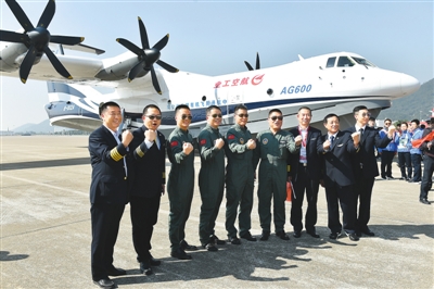 AG600完成首飛后,機(jī)組人員等與飛機(jī)合影留念 新華社記者 梁旭攝