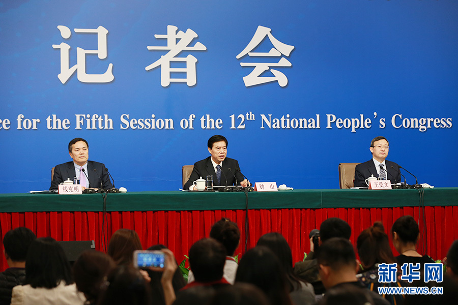 3月11日,十二屆全國人大五次會議新聞中心舉行記者會,主題是“改革開放調結構 創(chuàng)新驅動促發(fā)展”,商務部部長鐘山、副部長王受文、副部長錢克明出席并回答中外記者的提問。圖為記者會現(xiàn)場。 新華網(wǎng)/中國政府網(wǎng) 傅義洲 攝