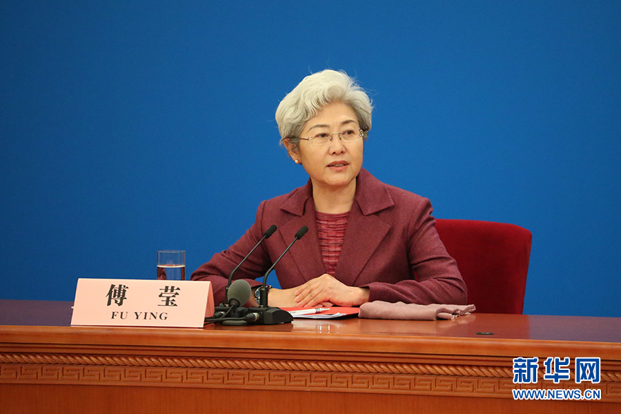 3月15日上午,國務(wù)院總理李克強(qiáng)在人民大會堂三樓金色大廳會見采訪十二屆全國人大五次會議的中外記者并回答記者提出的問題。圖為記者會主持人傅瑩。新華網(wǎng)/中國政府網(wǎng) 翟子赫 攝